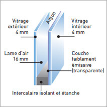 Le double vitrage est devenu la norme et a remplacé le simple vitrage au fil du temps. Il est composé de deux vitres séparées par une lame d’air sec ou de gaz neutre comme l’argon, qui aura pour but d’accroître ses performances isolantes. Le séparateur est destiné à assécher le gaz emprisonné à la fermeture du vitrage et à absorber la vapeur d’eau éventuelle.